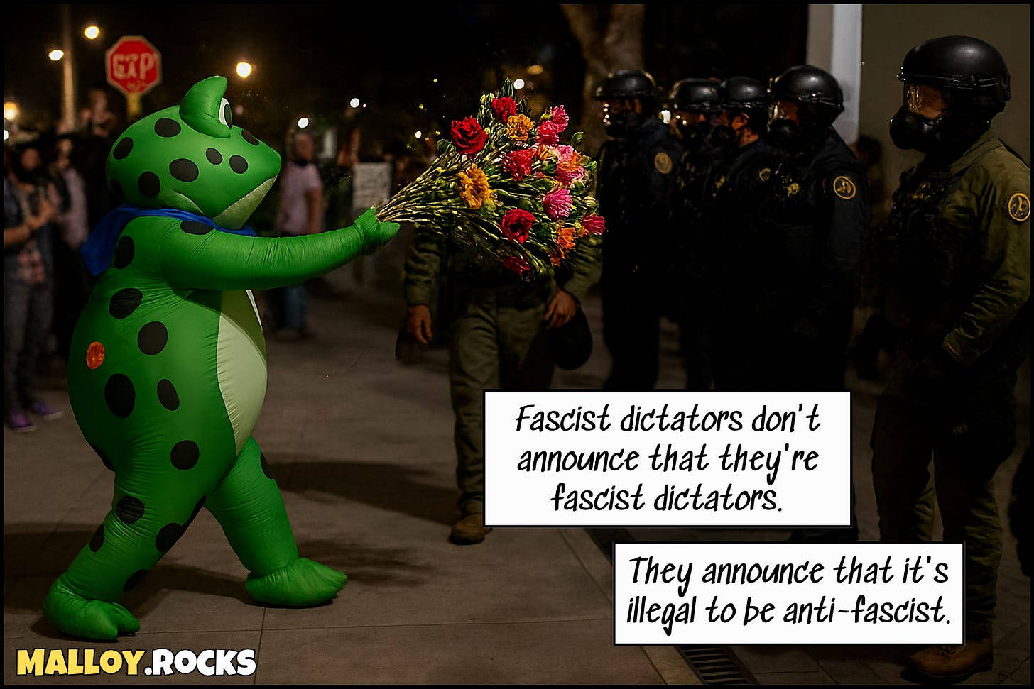 Fascist dictators don't announce that they're fascist dictators.They announce that it's illegal to be anti-fascist.Oliver Markus MalloyOct 17, 2025178558ShareSee you all at the No Kings protests on Saturday, October 18th! ❤If you like my comics, feel free to “steal” them. To receive new posts and support my work, consider becoming a free or paid subscriber.SubscribePreviousNext