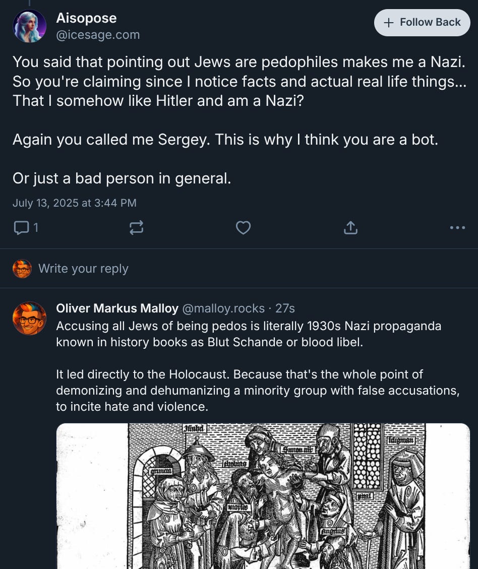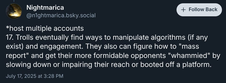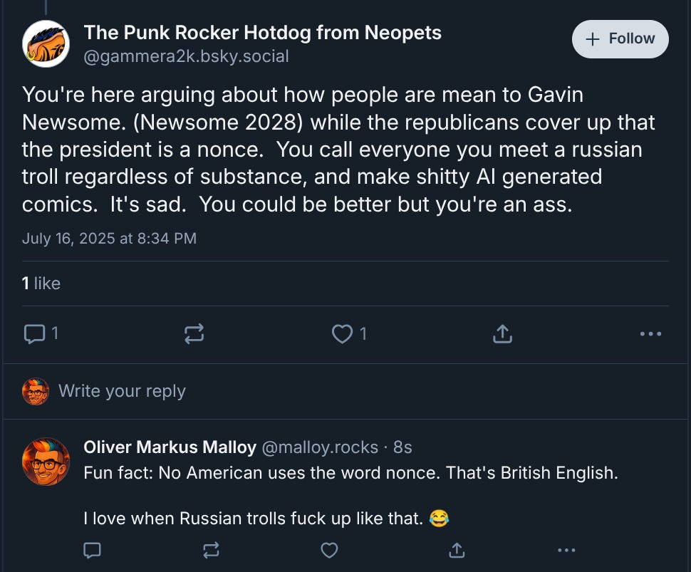 Anyway, now I’m also a target of Russian trolls on Bluesky. One of them bragged about getting me put on a block list, by falsely accusing me of transphobia. Russian trolls work in groups and mass report Democratic posts in bad faith to silence us.