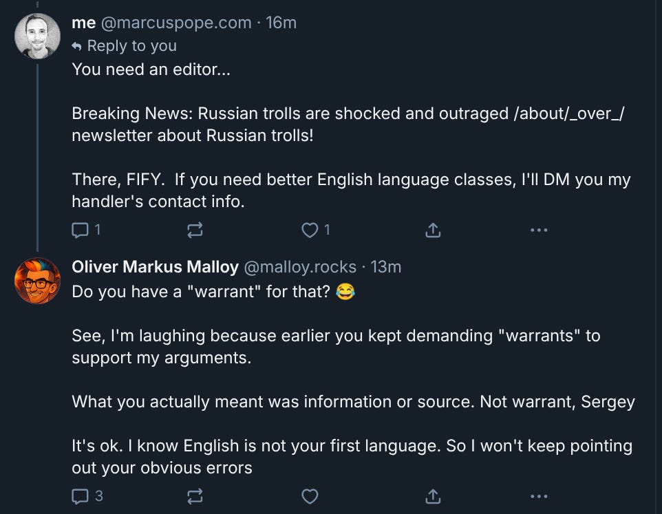 That’s why Russian trolls are so easy to spot. They have tells, and you can learn to recognize them instantly. They all follow the same troll farm script.