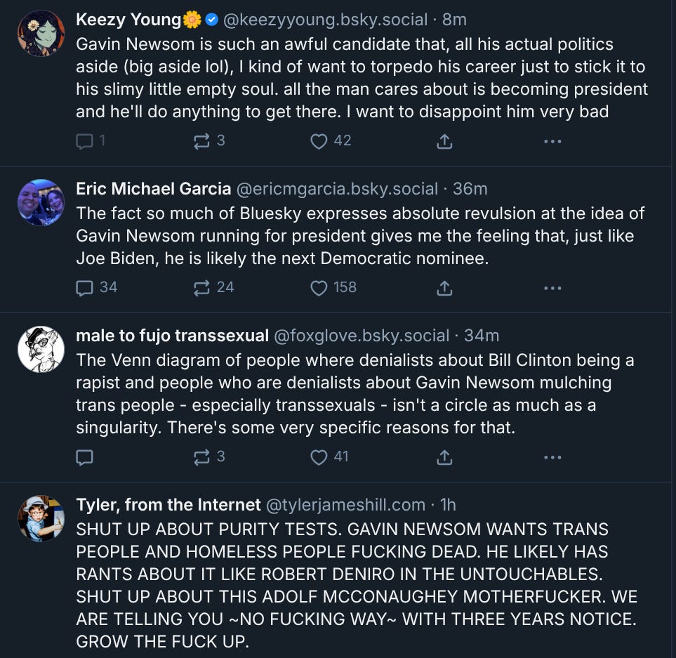 Well, honestly I’m fine with just about anyone at this point. I think Gavin would be perfect, but there are many other good choices. You’ll never see me talking shit about any Democrat.