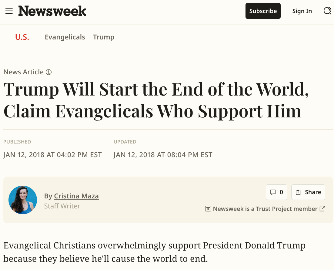 They support Trump because they think he will destroy the world and then Jesus comes back.