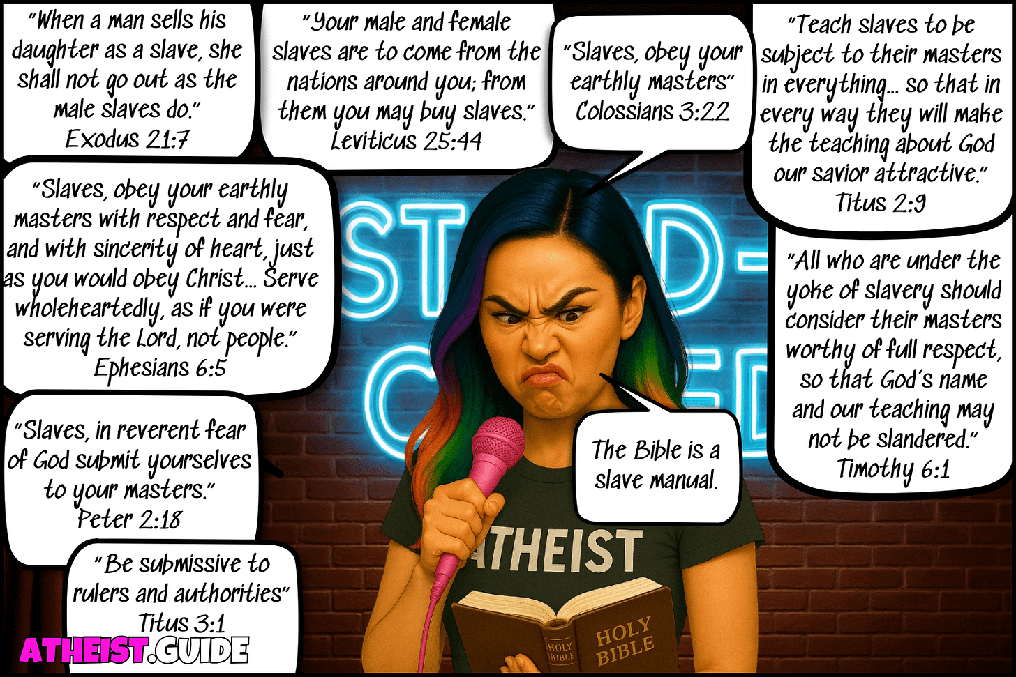 The Bible is a slave manual. It was published by robber barons and it tells peasants they must obey obey obey their masters, or God is gonna be really mad at them.
