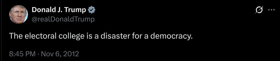 So, just a few years ago, even Trump himself admitted that the electoral college is total bullshit. In 2012, Trump called the electoral college an undemocratic travesty. A disaster for democracy.